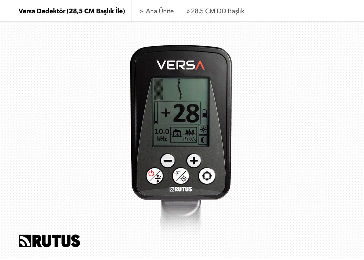 Rutus Versa Dedektörün ekranı güçlü güneş ışığında bile rahatça okunabilir. Rutus Versa Dedektör modelinin dikkat çekici bir özelliği, hedefin değerli mi yoksa önemsiz mi olduğunu gösteren görsel bir ekran kimliği grafiğine sahip olmasıdır. Ses ve sayı değerleri birleştirildiğinde, kullanıcıya hedefin niteliği hakkında önemli bilgiler sunarak kazma öncesi değerlendirme yapma imkanı tanır.